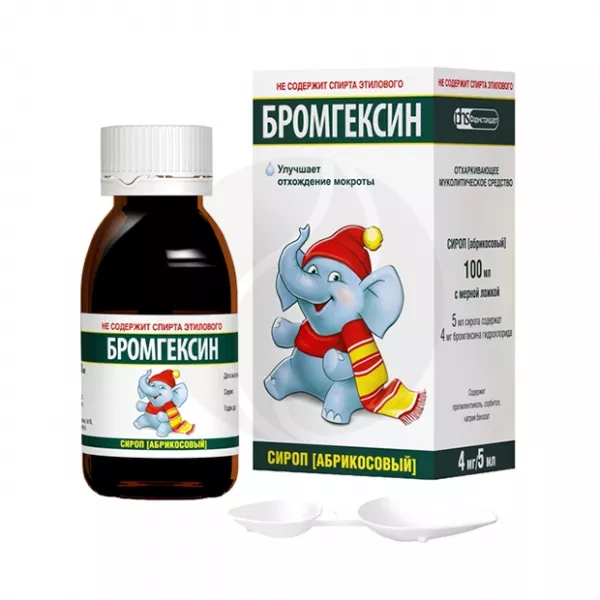 Сироп Бромгексина выпускается в флаконах по 100 мл. Это форма предпочтительна для детей и людей, которым тяжело проглатывать таблетки. Сироп можно принимать 2–3 раза в день, дозировка зависит от возраста пациента: детям до 2 лет – по 2,5 мл, детям от 2 до 6 лет – по 5 мл, а для старших – по 10 мл за раз.