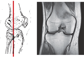 Магнитно-резонансное изображение крестообразных и боковых связок с мениском колена.