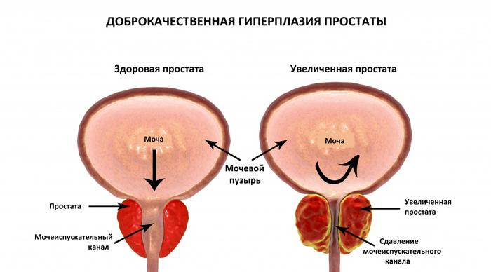 Доброкачественная (гиперплазия) или злокачественная опухоль простаты ведет к сужению мочепроводного канала, который проходит внутри железы. В результате возникают симптомы, объединяемые понятием «симптомы нижних мочевых путей»: частите позывы к мочеиспусканию без полного опорожнения пузыря, слабая струя мочи и подтекание после завершения акта мочеиспускания, а также ночные пробуждения для опорожнения пузыря.