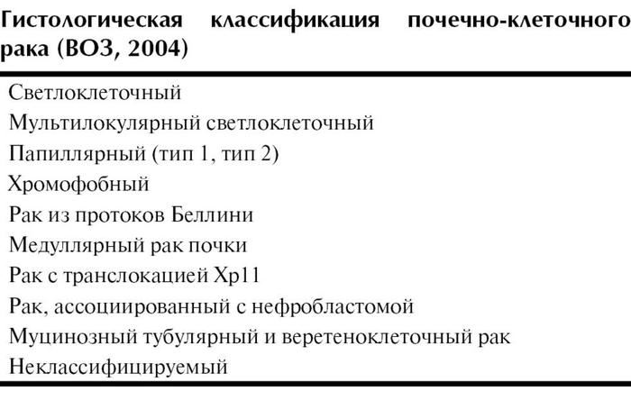 В 2004 году классификация почечно-клеточного рака была обновлена с учетом новых данных о ходе болезни и генетических особенностей. Удалены термины, такие как «зернисто-клеточная опухоль» и «хромофильный рак». К важнейшим факторам прогноза относятся гистологический тип опухоли, степень дифференцировки, размеры новообразования и наличие некроза.