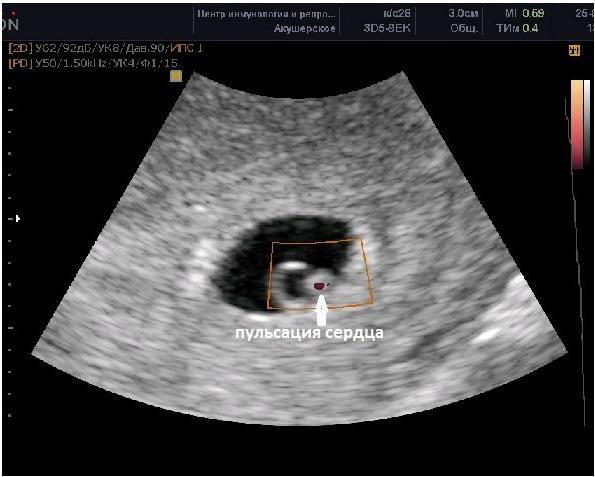 Внутри плодного яйца уже заметно «колечко с драгоценным камнем», которое обозначает желточный мешок и заметный эмбрион. Сердцебиение эмбриона начинает фиксироваться в начале 6-й акушерской недели. Наличие пульсации сердца считается надежным признаком успешного продолжения беременности.