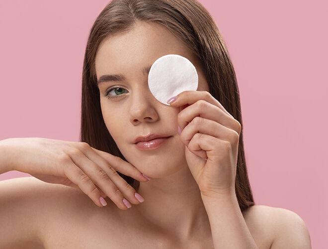 Используйте двухфазный демакияж или мицеллярную воду. Нанесите средство на ватные диски и прикладывайте к области глаз на 30-60 секунд.