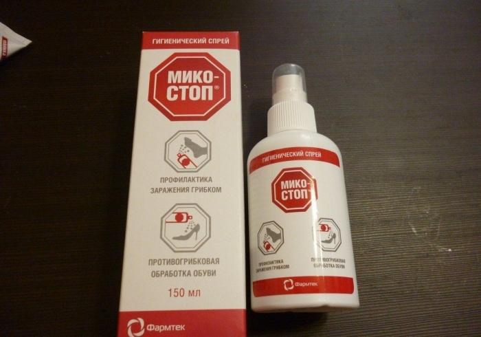 - «Микостоп» спрей. Этот продукт позволяет обеззараживать обувь от различных видов грибковых инфекций. Его легче всего использовать, так как он не оставляет следов на обуви. Этот спрей также подходит для обработки ногтей, инфицированных грибком. Для полного обеззараживания обуви потребуется применять его 5 и более раз;