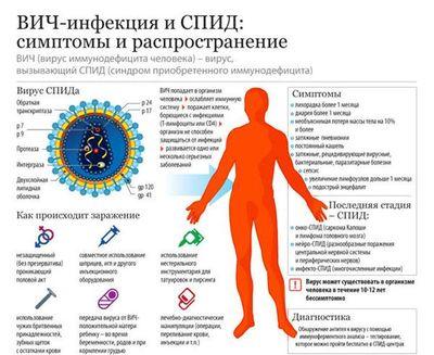 | Начальная симптоматика | В период инкубации, когда иммунная система только начинает подвергаться воздействию инфекции, организм активирует свои защитные механизмы. В результате этого могут проявиться такие признаки, как повышение температуры, появление мелкой красной сыпи на коже, увеличение лимфатических узлов и нарушения в работе кишечника. Эти симптомы можно легко перепутать с проявлениями простуды, и, соответственно, человек может начать принимать лекарства, снимающие эти проявления, не подозревая о присутствии вируса в организме. На данном этапе происходит значительное снижение числа Т-хелперов, что увеличивает риск развития пневмонии и туберкулеза. |