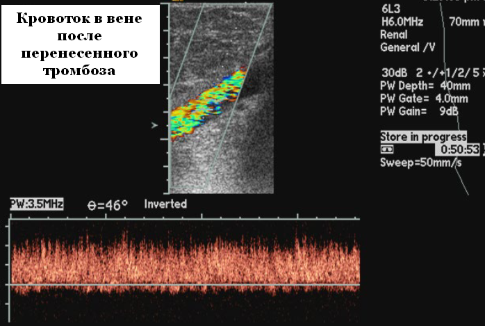 Для образования и прикрепления тромба к стенке сосуда нужно от 24 до 72 часов. Реканализация преимущественно происходит в течение трех-шести месяцев и описывается как наличие «паутинообразного» кровотока в вене.