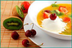 Все компоненты следует промыть и проварить на медленном огне в течение 15 минут, после чего их нужно измельчить и вернуть обратно в кастрюлю. Рис варится отдельно и добавляется в суп. Дать покипеть еще 5 минут. Подавайте с медом, сметаной или вареньем.