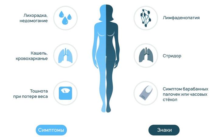 Хитрость болезни заключается в том, что на ранних стадиях она может никак не проявляться. Симптомы начинают проявляться уже на поздних стадиях. Например, устойчивый кашель, который не поддается лечению, постоянные боли в области груди, одышка, кровохарканье (наличие крови в мокроте), усталость, потеря веса и частые воспаления легких.