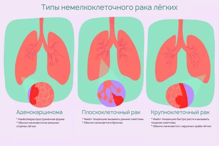 Среди самых распространенных форм выделяют немелкоклеточный (НМРЛ) и мелкоклеточный (МРЛ) рак легких. Первый тип в большинстве случаев прогрессирует медленно, а второй — более редкий и намного быстрее развивается. Выбор методов лечения и дальнейший прогноз зависят от подтипа рака, его стадии и наличия сопутствующих заболеваний пациента.