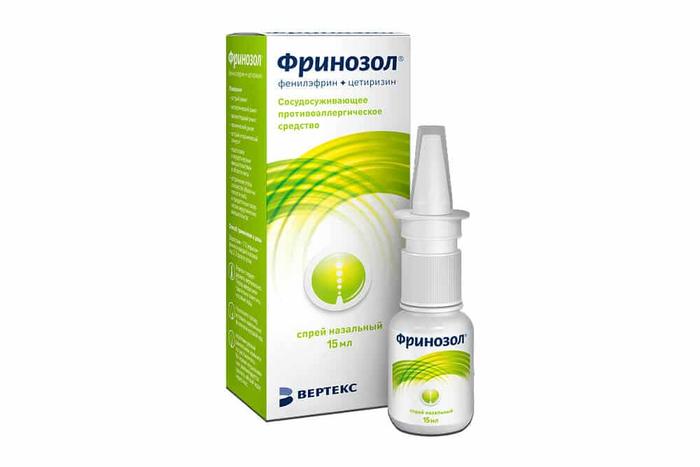 Фринозол – комбинированный продукт российского производства, обладающий как сосудосуживающим, так и противоаллергическим эффектом. Он доступен в виде назального спрея.