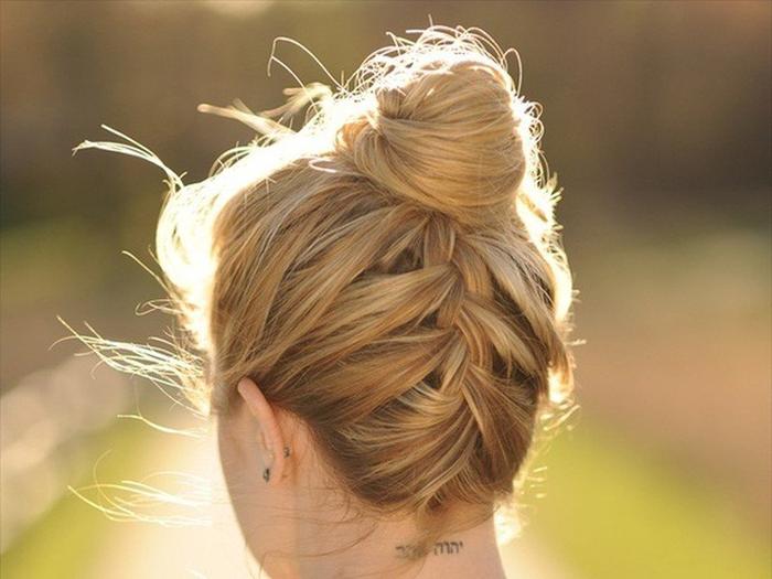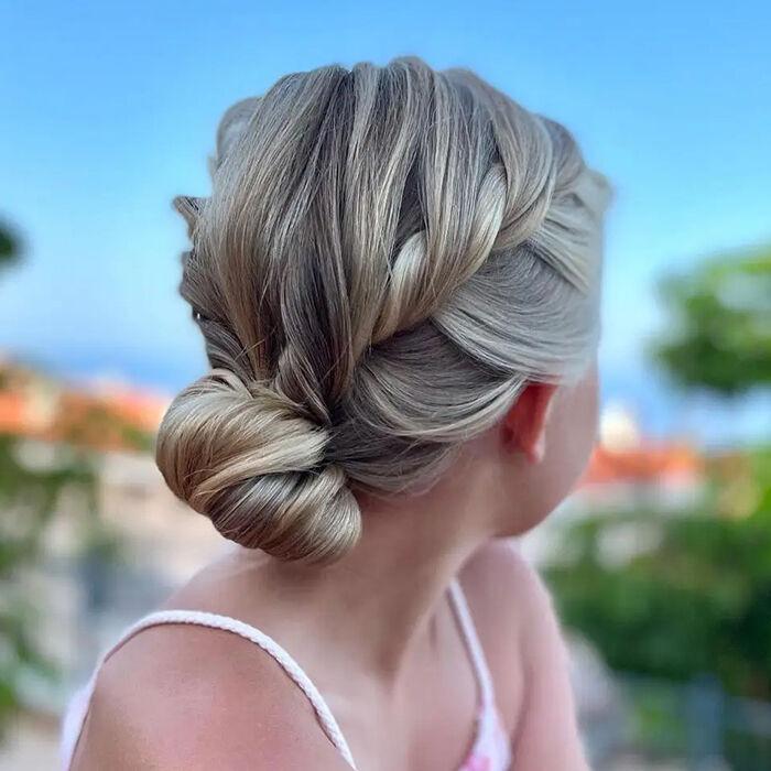 - Скрутите косу в пучок, симпатично напоминающий цветок.
