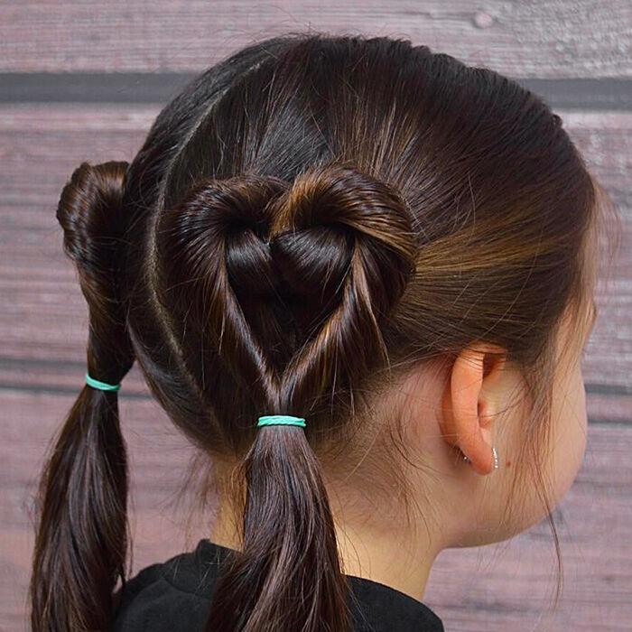Простая прическа, состоящая из двух зафиксированных хвостиков, которые, перевернув, образуют милое сердечко — ваша дочка будет в восторге!