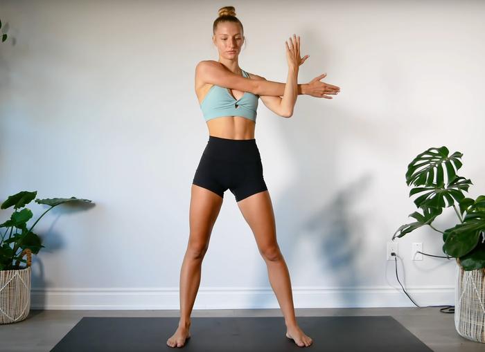 Мельница – это известное упражнение, которое позволяет растянуть все тело после интенсивной тренировки. Расставьте ноги шире плеч и подняв руки в стороны, наклонитесь вперед, последовательно касаясь пальцами рук стоп. Если не получается дотянуться, просто тянитесь к ним.