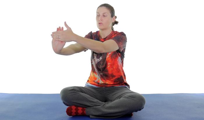 Вытяните руку вперед, ладонь направьте вверх. Другая рука надавливает на пальцы, оттягивая их вниз.
