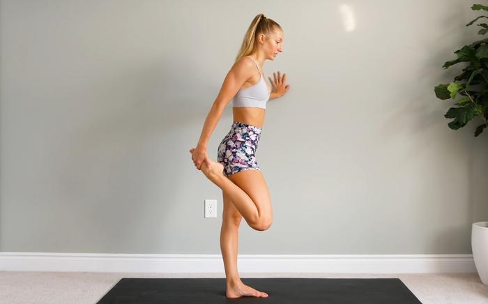 - Сгибая одну ногу в колене, отведите ее назад и схватите стопу руками. Прижимая стопу к ягодицам, растяните квадрицепсы.