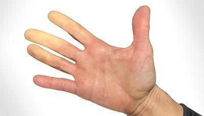 - болезнью Рейно. Это одно из самых распространённых состояний, приводящих к онемению пальцев рук. Из-за болезни нарушается кровообращение в мелких сосудах кистей или стоп, что может проявляться бледностью кожи и покалыванием.