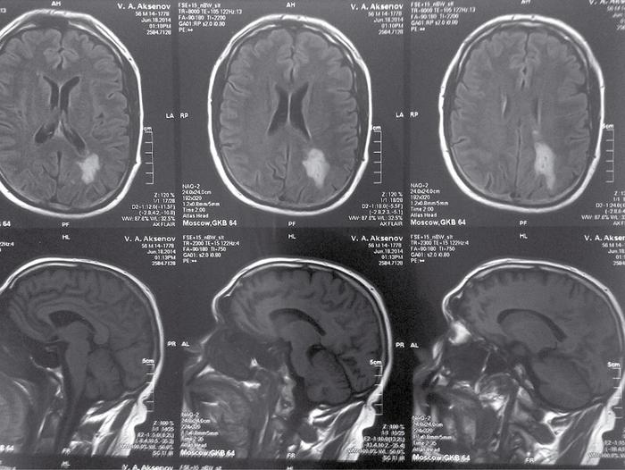 При неврологическом обследовании в момент обращения не было выявлено явных очаговых симптомов. Нейровестибулярное исследование показало отсутствие спонтанного и позиционного нистагма. МРТ выявила изменения, соответствующие недавно перенесенному ишемическому инсульту в области теменно-затылочных районов левого полушария.