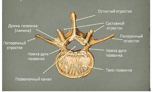 В общем виде структура позвонков включает: тело, дуги, 2 ножки, 2 поперечные и 4 суставные отростка. Дуга, тело и ножки образуют позвоночный канал, где располагается спинной мозг.
