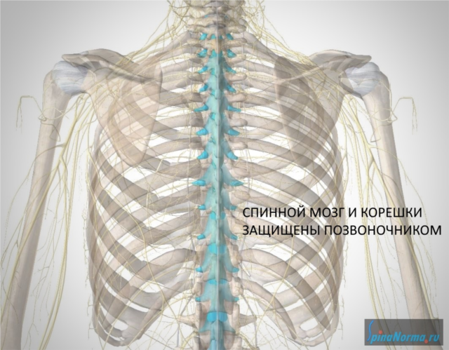 Структуры позвоночника, защищая спинной мозг, тесно взаимодействуют с ним, а также с его корешками и нервами, что позволяет поддерживать работу соответствующих внутренних органов и элементов опорно-двигательного аппарата. Спинной мозг располагается в позвоночном канале и простирается от края затылочного отверстия черепа до первого-второго поясничных позвонков, постепенно истончается и заканчивается конусообразной структурой. Ниже спинного мозга располагается пучок нервных корешков, известный как «конский хвост».