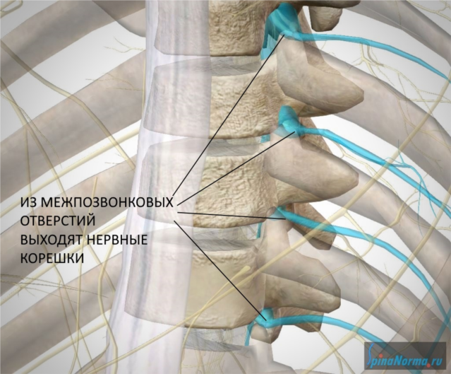 От спинного мозга уходят 31 пара нервных корешков, которые выходят из позвоночного канала сквозь межпозвонковые отверстия, сформированные ножками и суставными отростками соседних позвонков.