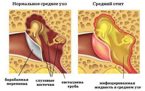 Острому среднему отиту часто предшествует острая респираторная инфекция, приводящая к нарушению защитной и транспортной функций мерцательного эпителия слуховой трубы. Это создает предпосылки для проникновения патогенных микроорганизмов из носоглотки в барабанную полость. В результате наблюдается снижение внутрибарабанного давления и начало выделения жидкости (плазмы и форменных элементов крови) из сосудов слизистой среднего уха, что ведет к воспалительному процессу, зачастую с гнойным содержимым.