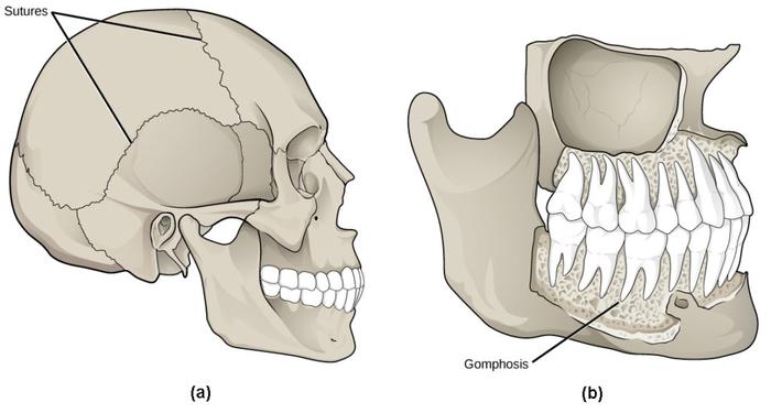 Это неподвижные фиброзные соединения, где короткие коллагеновые волокна связывают кости черепа. Швы могут быть зубчатыми, плоскими и чешуйчатыми.