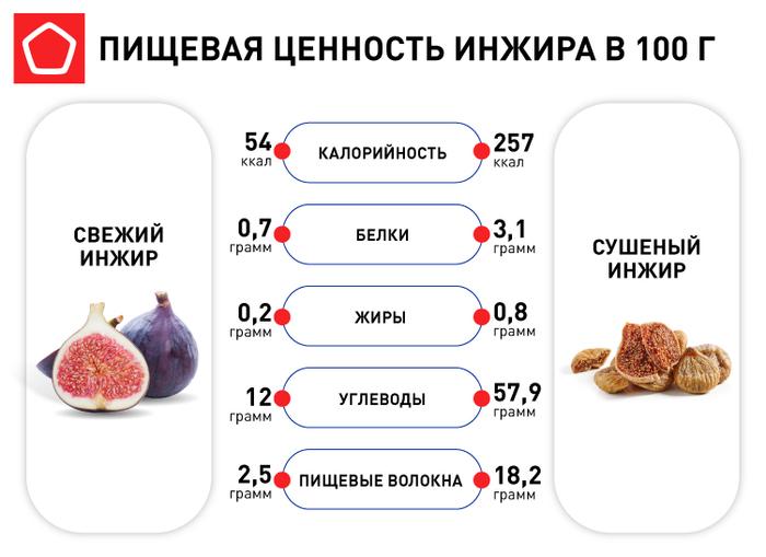 По данным справочника Скурихина И. М. и Тутельяна В. А., на 100 г свежего инжира содержится около 54 ккал, 0,7 г белков, 0,2 г жиров, 12 г углеводов и 2,5 г клетчатки. Инжир богат витаминами B4, C, B6, B3 и B5, а также калием, кальцием, магнием, фосфором, натрием. Рассмотрим, как регулярное употребление инжира влияет на здоровье.